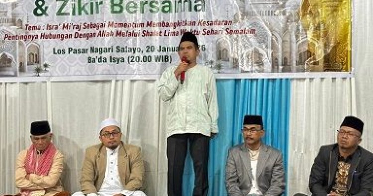 SOLOK – Wakil Bupati Solok, H. Candra, S.H.I., menghadiri peringatan Isra Mi’raj Nabi Muhammad SAW yang digelar di Nagari Selayo, Kecamatan Kubung, Kabupaten Solok, Selasa (20/1). Kegiatan yang berlangsung di Los Pasar Selayo, tepat di depan Kantor Wali Nagari Selayo ini dihadiri unsur pemerintahan, tokoh agama, serta masyarakat setempat.